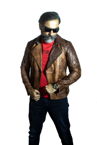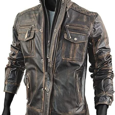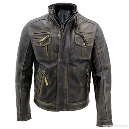 SHHUT Men’s Brown Multipocket Vintage Biker Retro Cafe Racer Distressed Genuine Leather Jacket